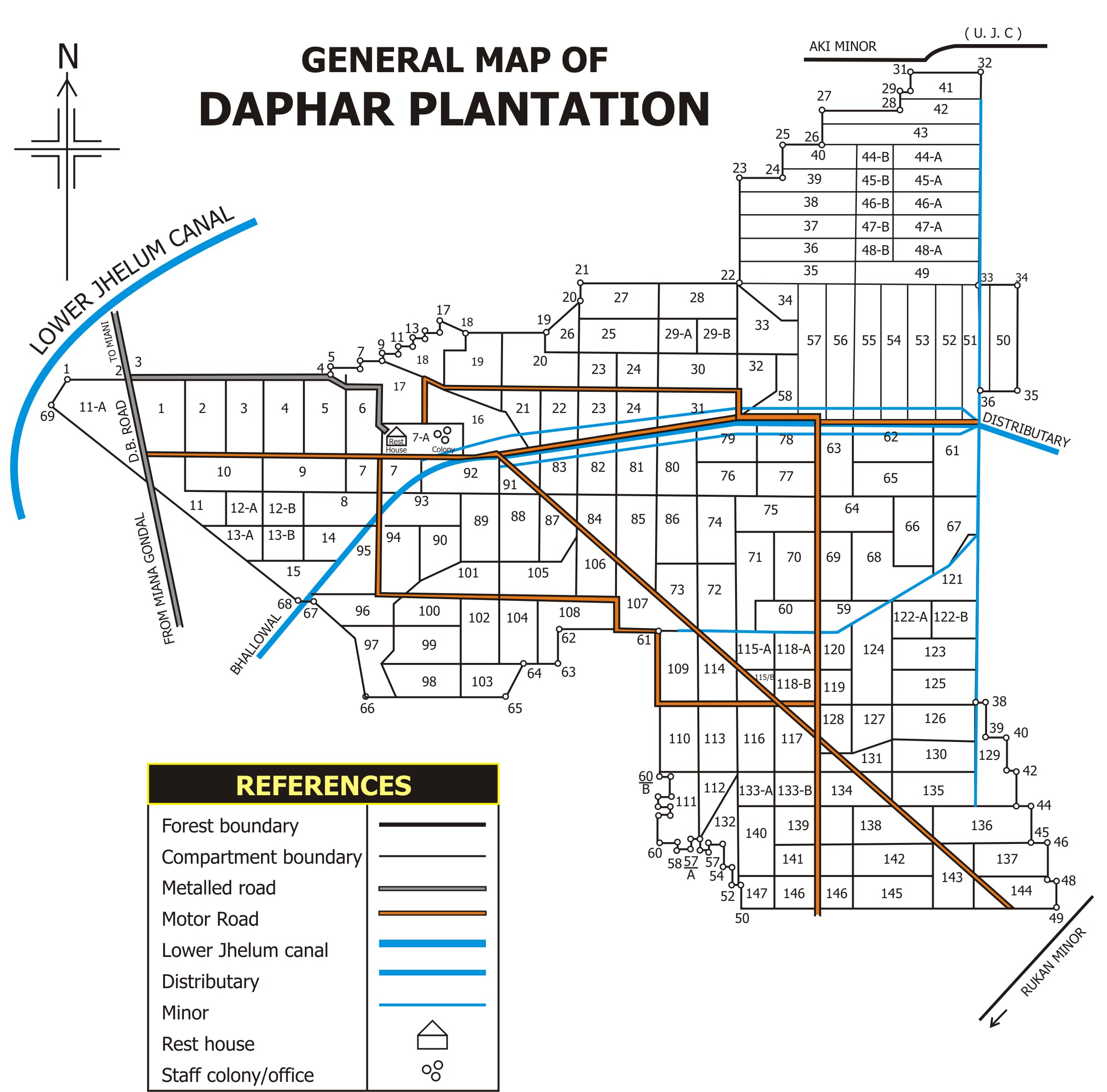 The Daphar Plantation is Reserved Forest having an area of 7135 acres. It is situated at the intersection of latitude 32°- 26’ north and longitude 73° - '11’ east in the Malikwal Tehsil of Mandi Bahauddin District, about 9.6 KM to the South of Pakhowal Railway Station. It is being irrigated from Bhalwal distributaries with a sanctioned discharge of 86 cusec. The Sub Divisional headquarter lies at a distance of 112 K.M. from Gujrat via Phalia and 80 KM from Sargodha via Bhalwal. The ground generally slopes down from east to west. The soil of Daphar Plantation is in general the gift of river action. It is on the whole alluvium with varying proportions of clay and sand. Technically speaking the area falls within the true-arid division of the semi-arid climatic zone. The hottest months of the year are May and June (i.e 41.1C°) while January is the coldest one. The rainfall is very erratic and most of its is received during the months of July and August (i.e. 262.1 & 224.6) The area was a typical dry tropical forest known as ‘Rakh’ before it was felled from 1882 to 1901. The original vegetation consisted mainly of Van (Salvadora oleoides Done), Jand (Prosopis cineraria Linn.), Karir (Capparis decidua Pax.), Mallah (Zizyphus nummularia W&A.), Ber (Zizyphus mauritiana Lamk.), Chamror (Ehretia laevis Roxb.), Rehru (Acacia leucophloea Willd.), Lahura (Tecoma undulata (Smith Seem.), Frash (Tamarix aphylla Karst.), Kangu (Lycium europaeum Linn.), etc. etc. These species occurred in groves and patches with sufficient space in between. The general height of the trees varied from 15 feet to 30 feet (4.5m to 9m). There were mounds and depressions. The mounds were covered with xerophytic species while Dhak (Butea monosperma, Lamk. Taub.), Lasura (Cordia dichotoma), Jangli-anar (Punica granatum Linn.), Phagwara (Ficus palmata Forsk.), etc. etc. were found in depressions. A few trees of kikar and shisham could also be found on relatively favorable sites. Presently Shisham and Mulberry are the principal species growing in mixture over a major portion of the plantation area. Other species growing are Eucalyptus, hybrid-poplar, semal, bakain and kiker. Bamboo are also grown on experimental basis. Every years about 300 acres are being afforestated / regenerated.